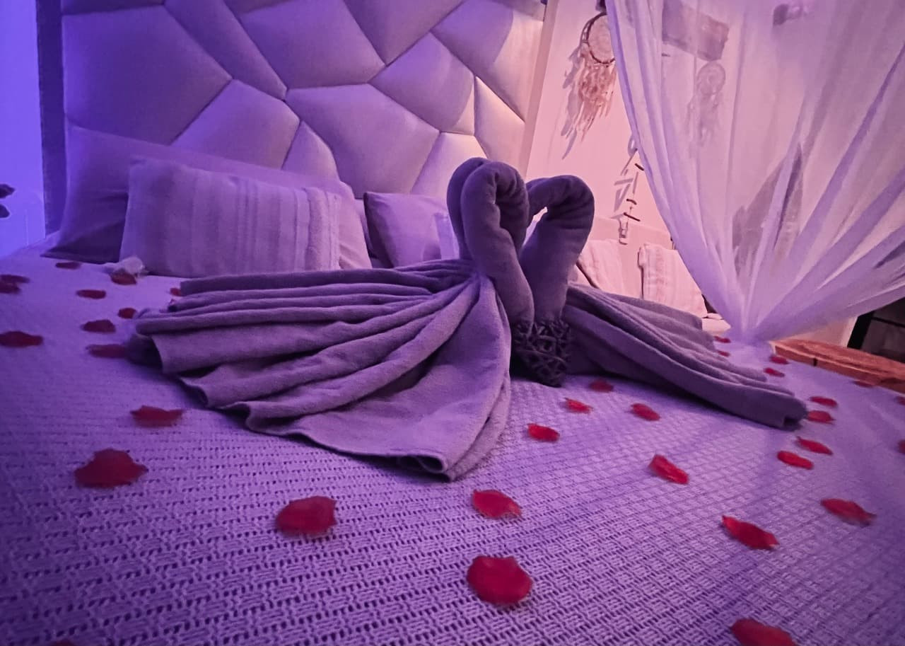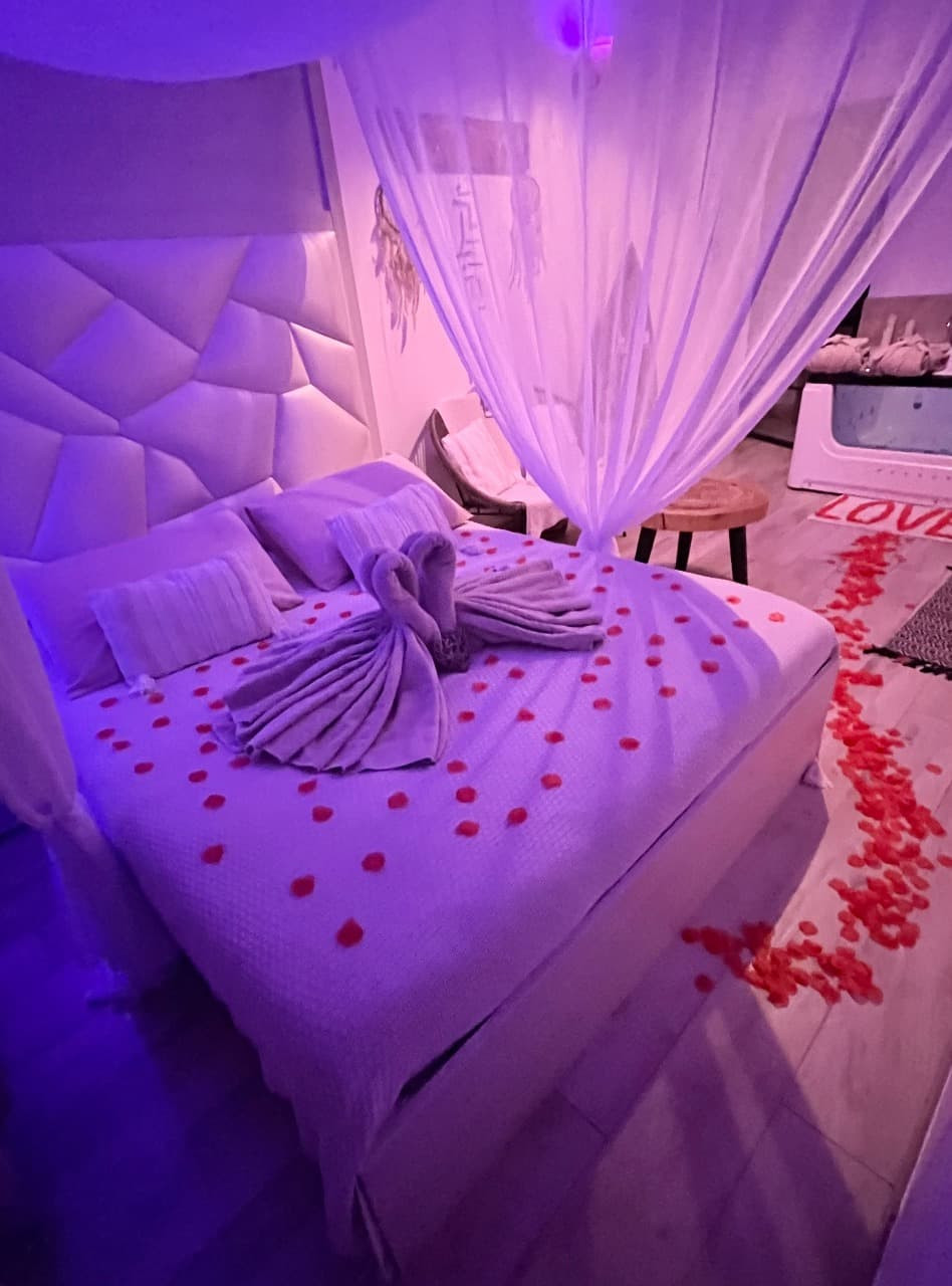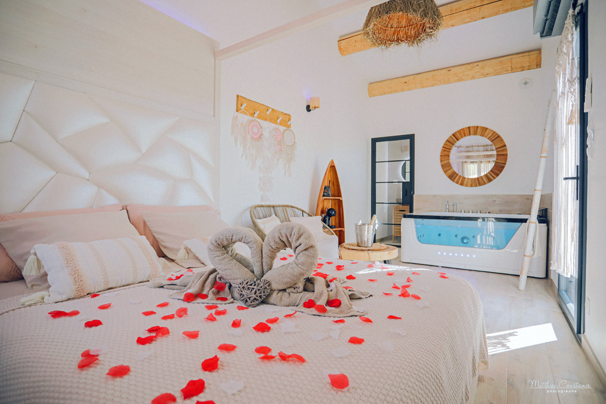 Pour encore plus de romantisme nous proposons l’option suite nuptiale digne d’une nuit de noce comprenant une décoration sur mesure avec un voilage blanc ainsi que des pétales de roses (synthétiques).