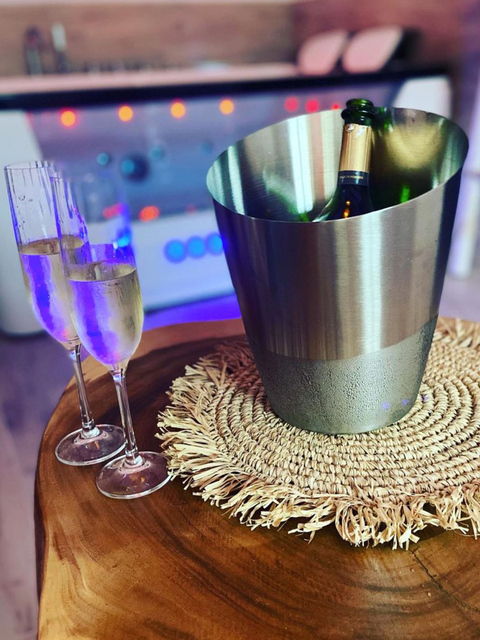 Elle est équipée d’un spa de luxe de type jacuzzi deux places avec 51 jets de massage et fonction chromothérapie où vous pourrez vous relaxer accompagné de votre moitié, nous précisons que par mesure d’hygiène le spa est vidé et nettoyé après chaque passage.